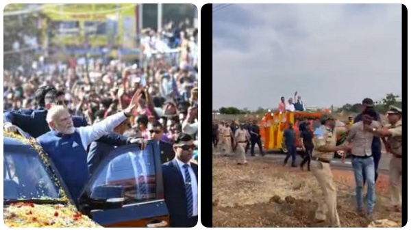 தடுப்பை தாண்டி "ஒரே ஜம்ப்.." பிரதமரை நோக்கி ஓடிய இளைஞர்! குறுக்கே பாய்ந்த போலீஸ்! கர்நாடகாவில் பரபர