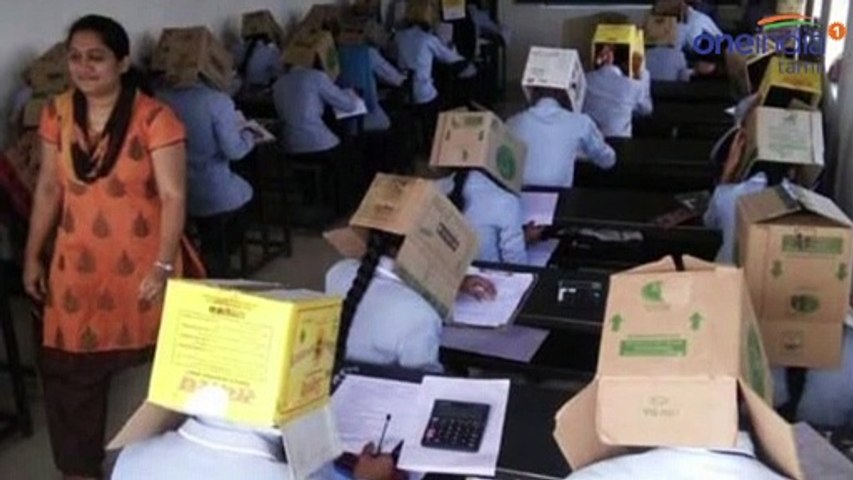 இதை பார்த்த அனைவரும் ஒரு நிமிடம் அதிர்ச்சியில் உறைந்தனர். ஏனெனில் மாணவர், மாணவியர் அனைவர் தலையிலும் அட்டைப்பெட்டி ஒன்று கவிழ்க்கப்பட்ட நிலையில்தான் தேர்வு எழுதினர்.