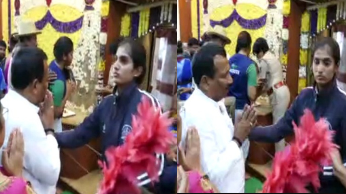 இதை கேட்டு அந்த பெண் போலீஸ் ஷாக்காகி நின்றார். இதையடுத்து வருவாய்த்துறை அதிகாரிகள் அமைச்சர் ஆர்பி திம்மாபூரை கோவிலுக்குள் அழைத்து சென்று தரிசனம் செய்ய வைத்தனர். அமைச்சர் ஆர்பி திம்மாபூர் கோவில் கருவறை சென்று தரிசனம் செய்து திரும்பினார். இந்த சம்பவம் சிறிது நேரம் ஹாசனாம்பா கோவிலில் பரபரப்பை ஏற்படுத்தியது.