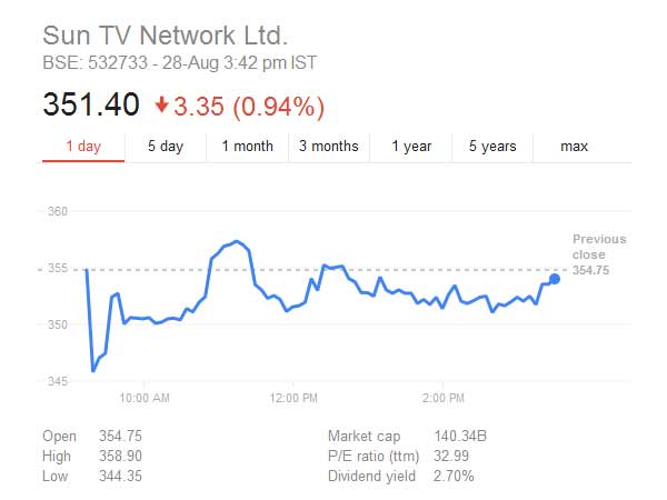 இந்த மாதம் ஆகஸ்ட் 7-ந் தேதியன்று சன் டிவியின் பங்கு ரூ422.0 ஆக இருந்தது. இது படிப்படியாக குறைந்து கொண்டே வந்தது.