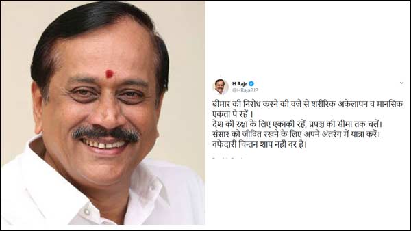 21 நாட்கள் தனிமைப்படுத்தி கொள்ள வேண்டும் என எச்.ராஜா பதிவிட்டுள்ளார்