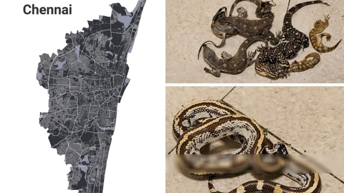 இதில் 6 நல்ல பாம்புகள், வட அமெரிக்காவின் கலிபோர்னியா வனப்பகுதியில் காணப்படும் 8 ராஜ நாகங்கள், ஒரு சிவப்பு சுருட்டைப் பாம்பு, இந்தோனேசியாவைச் சேர்ந்த 2 நீல நாக்கு பாம்புகள், 2 சதுப்பு நிலப் பாம்புகள் மற்றும் 10 நீர் உடும்புகள் ஆகியவை இருந்தன. உடனடியாக அந்த நபரைக் கைது செய்த அதிகாரிகள், கடத்தி வரப்பட்ட 34 உயிரினங்களையும் பறிமுதல் செய்தனர்.