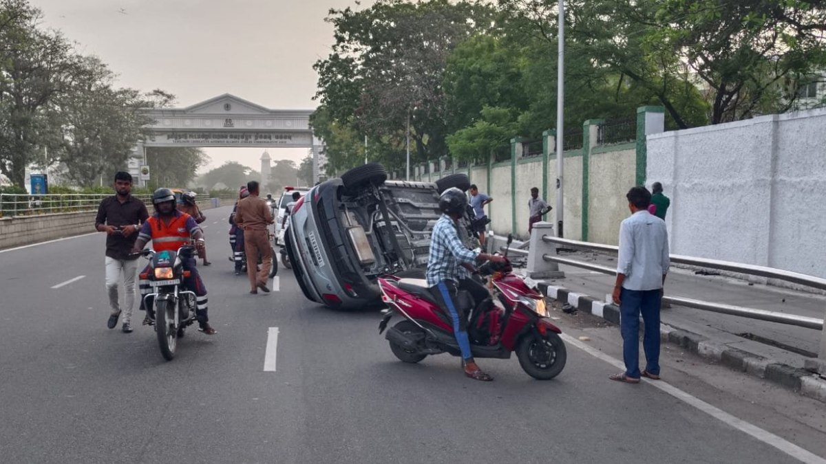 இதையடுத்து கார் கட்டுப்பாட்டை இழந்து பக்கவாட்டு தடுப்புச்சுவரில் மோதி, 3 முறை புரண்டு தலைகுப்புற கவிழ்ந்தது. அந்த வழியாகச் சென்றவர்கள், காரில் இருந்தவர்களை மீட்டு மருத்துவமனையில் முதலுதவி சிகிச்சைக்காக அனுமதித்தனர்.