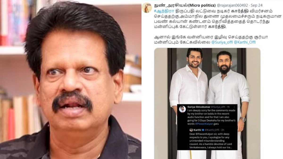 கார்த்தி தவறாக ஒன்று பேசவே இல்லை. அவர் என்னிடம் லட்டு பற்றி எதையும் கேட்காதீர்கள் என்றுதான் சொல்கிறார். அதில் ஒரு தவறும் இல்லை. ஆனால், உடனே போய் மன்னிப்பு கேட்கிறார். ஒன்றுமே பேசாத போது நம்மிடம் ஏன் பவன் பாய்கிறார் என்றுதானே கார்த்தி யோசித்து இருக்க வேண்டும்?