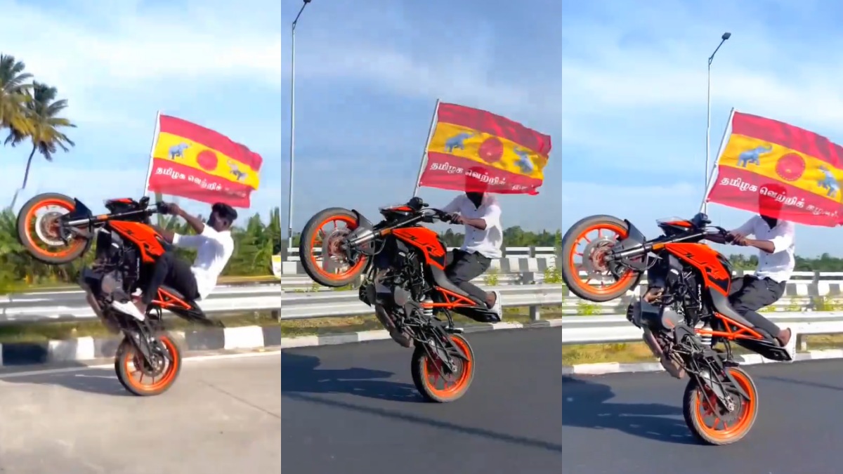 இந்த நிலையில் தமிழக வெற்றிக் கழகத்தின் கொடியுடன் தேசிய நெடுஞ்சாலையில் இளைஞர் ஒருவர் மோட்டார் சைக்கிளில் அதிவேகமாக சாகசம் செய்தபடி சென்றார். மின்னல் வேகத்தில் சாலையில் முன் வீல்களை தூக்கியபடி சீறிப் பாய்ந்த பைக்கரால் வாகன ஓட்டிகள் அச்சத்துடனேயே வாகனங்களை இயக்கினர். மேலும் தனுஷின் கொடி படத்தின் மியூசிக்கை பின்னணி கோர்த்து அதனை ரீல்ஸ் ஆகவும், வெளியிட்டுள்ளார்.