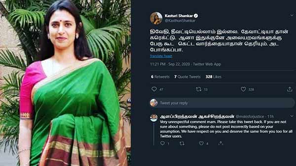 உடனடியாக @mskisforjustice என்ற நெட்டிசன், உங்க யூகத்துக்கு எல்லாம் போஸ்ட் செய்யாதீங்க.. எதையும் சரியாக புரிந்து கொண்டு போடுங்க.. என்று சொன்னதுடன் கஸ்தூரிக்கு அட்வைஸும் செய்திருந்தார். ஆனால் கஸ்தூரியோ, நீங்கதான் தப்பா புரிஞ்சுகிட்டீங்க என பதில் கொடுத்தார். @kenanandu1 என்ற நெட்டிசனோ, தேவையான நேரத்தில கியூமர் போட்டு கலாய்க்கிறதில உங்களுக்கு நிகர் நீங்க தாம்பா! என புகழவும் செய்திருக்கிறார்.