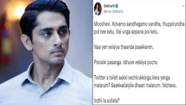 இதை பார்த்த சித்தார்த் கடும் கொந்தளிப்புக்குள்ளாகினார். இதையடுத்து அவர் தனது பதிலில் மூதேவி கோவமோ, சந்தேகமோ வந்தா துப்பிருந்தா போய் நீ கேளு, இல்லை உங்க அப்பன போய் கேளு, நான் என் வேலையை தாண்டா பாக்குறேன், பொறுக்கி பசங்க, இதுவே வேலையா போச்சு, ட்விட்டர டாய்லெட்டாக்கி வச்சிருக்கீங்க. வேற எங்க மலரும், சாக்கடையில்தான் மலரும், எழவு. இந்தியில சொல்ட்டா? என சித்தார்த் பதிலடி கொடுத்துள்ளார். இதை நெட்டிசன்கள் கடுமையாக கண்டித்துள்ளனர். சிலர் சித்தார்த்திற்கு பாராட்டுகளை தெரிவித்துள்ளார்கள்.