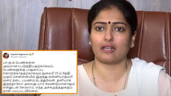 "பெண்ணுக்கு அவமரியாதை.." வெகுண்டெழுந்த காயத்ரி ரகுராம்.. சென்னை டூ கன்னியாகுமரிக்கு நடைபயணம்