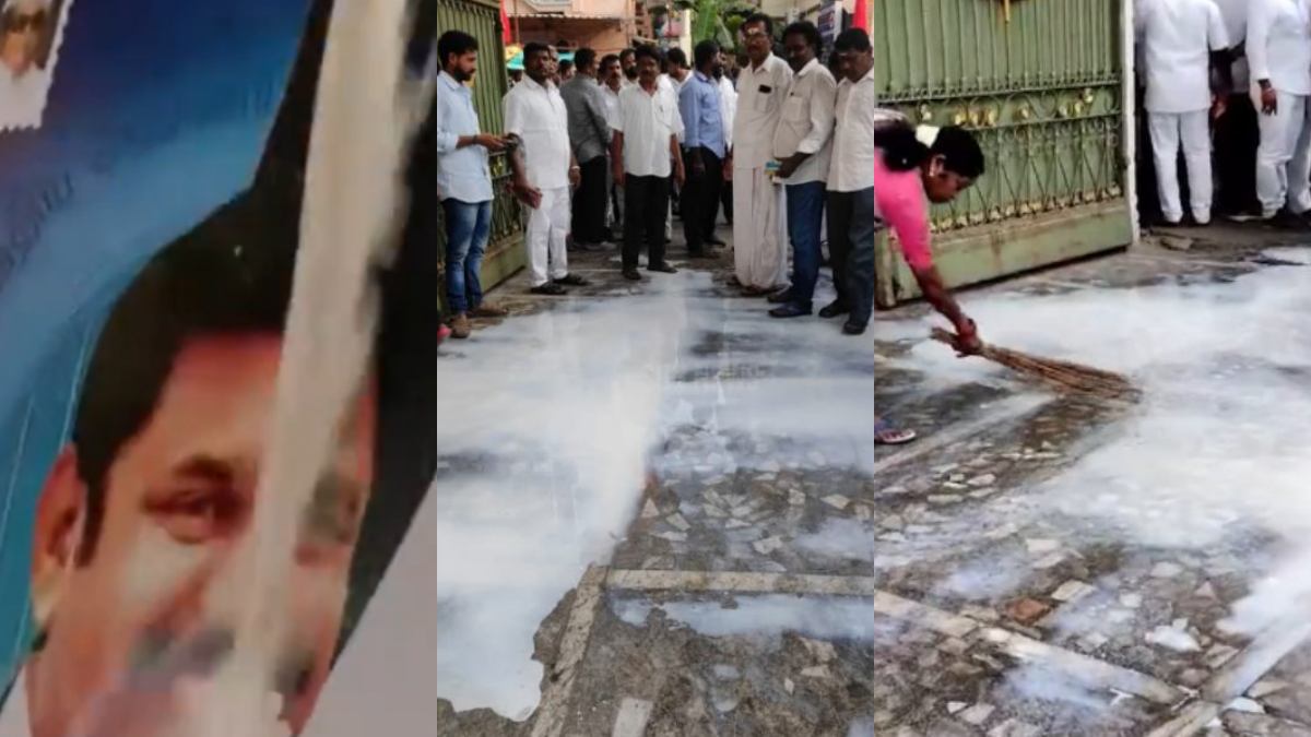 சுத்தம் செய்த தொண்டர்கள்: "கழகப் பொதுச்செயலாளர் எடப்பாடி பழனிசாமி" என்றும் "நாளைய முதல்வர் எடப்பாடி" என்று கோஷமிட்ட அதிமுக தொண்டர்கள், அங்கே இருந்த எடப்பாடி பழனிசாமி படத்திற்குப் பால் ஊற்றி அபிஷேகம் செய்தனர். இருப்பினும், இந்த செயலாளர் பல லிட்டர் பால் வீணாக வீணடிக்கப்பட்டது. பால் அபிஷேகத்தால் வீணாக்கப்பட்ட பால் நுழைவாயிலில் தேங்கிக் கிடந்த நிலையில், தொண்டர்களை வைத்தே சுத்தம் செய்யப்பட்டது! இது தொடர்பான வீடியோவும் இணையத்தில் வேகமாகப் பரவி வருகிறது.