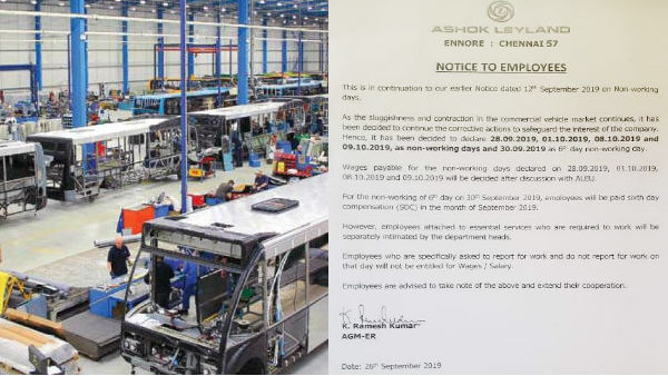 இந்நிலையில் அசோக் லேலண்ட் நிறுவனம் மீண்டும் ஐந்து நாட்களை தனது ஊழியர்களுக்கு வேலையில்லாத நாளாக அறிவித்துள்ளது. அந்த நிறுவனம் வெளியிட்டுள்ள அறிவிப்பின் படி, "வாகன விற்பனையில் மந்தநிலை தொடர்ந்து வருவதன் காரணமாக நிறுவனத்தின் நலனுக்காக சில முடிவுகளை நிறுவனம் எடுத்திருக்கிறது. இதன்படி செப்டம்பர் 28ம் தேதி மற்றும் செப்டம்பர் 30ம் தேதி மற்றும் அக்டோபர் 1ம் தேதி மற்றும் அக்டோபர் 8ம் தேதி மற்றும் அக்டோபர் 9ம் தேதி ஆகிய நாட்கள் வேலையில்லாத நாட்கள் ஆக அறிவிக்கப்பட்டுள்ளது