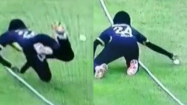 மலேசிய அணி வீராங்கனை அரியானா 15வது ஓவரை வீசிக்கொண்டு இருந்தார். அப்போது தாய்லாந்து வீராங்கனை கோன்சரஏங்கி என்பவர் பேட்டிங் செய்து கொண்டு இருந்தார். அந்த ஓவரில் 4வது பந்தை டீப் மிட் விக்கெட் திசையை நோக்கி கோன்சரஏங்கி அடித்தார். பவுண்டரி செல்ல வேண்டிய இந்த பந்தை மலேசிய வீராங்கனை கஷ்டப்பட்டு தடுத்தார். பவுண்டரி லைனுக்குள் சென்று கஷ்டப்பட்டு தடுத்தார்.