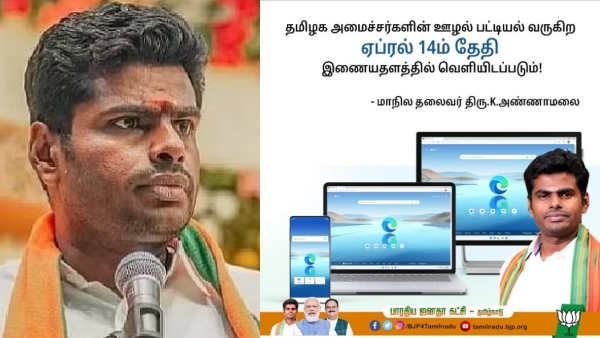 இந்நிலையில் பாஜக தமிழ்நாடு ட்விட்டர் பக்கத்தில், தமிழ்நாடு அமைச்சர்களின் ஊழல் பட்டியல் வருகிற ஏப்ரல் 14ஆம் தேதி இணையதளத்தில் வெளியிடப்படும் என்று பதிவிடப்பட்டுள்ளது. போன், கம்ப்யூட்டர் என எதிலும் பார்க்கும்படி, அந்த ஊழல் பட்டியல் இணையதளத்தில் வெளியிடப்படும் என்பதை விளக்கும் வகையிலான படத்துடன் இந்தத் தகவலைப் பகிர்ந்துள்ளது தமிழ்நாடு பாஜக. இதனால், அரசியல் அரங்கில் பரபரப்பு ஏற்பட்டுள்ளது.