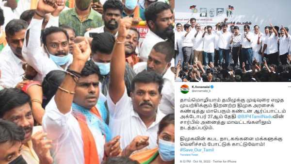 இது தொடா்பாக பாஜக மாநில தலைவர் அண்ணாமலை தனது ட்விட்டர் பக்கத்தில், தாய்மொழியாம் தமிழுக்கு முடிவுரை எழுத முயற்சிக்கும் திமுக அரசைக் கண்டித்து கண்டன ஆா்ப்பாட்டம் அக்டோபா் 27-இல் அனைத்து மாவட்டங்களிலும் நடத்தப்படும். திமுகவின் கபட நாடகங்களை மக்களுக்கு வெளிச்சம் போட்டுக் காட்டுவோம் என்று கூறியுள்ளாா். ஹிந்தி திணிப்புக்கு எதிராக சட்டப்பேரவையில் திமுக அரசு தீா்மானம் நிறைவேற்றியிருந்தது. அதை கண்டிக்கும் வகையில் இந்தப் போராட்டத்தை அண்ணாமலை அறிவித்துள்ளாா்.