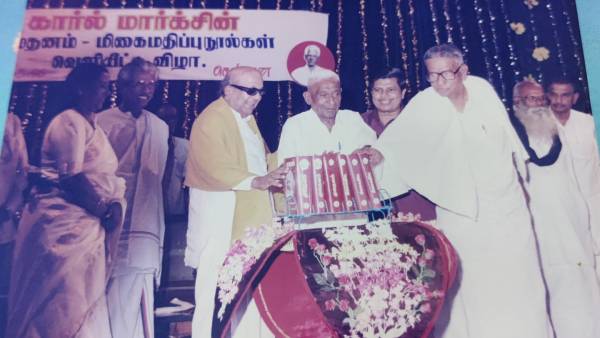 படம். ஜமதக்னி தமிழாக்கம் செய்த காரல் மார்க்சு மூலதனம் மிகை மதிப்பு நூல்களை வெளியிட்ட போது- மறைந்த முதல்வர்.கலைஞர், இடதுசாரி தலைவர்கள் கே.டி.கே.தங்கமணி, சங்கரய்யா, பெரியாரிய போராளி வே ஆனைமுத்து, சிலம்பொலி செல்லப்பன், எனது வாழ்விணையர் ஜமதக்னி சாந்தி, முன்னாள் அமைச்சர் தமிழ்க்குடி மகன்.