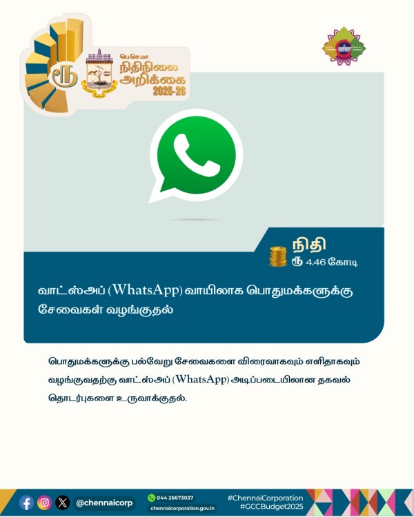 பொதுமக்களுக்கு பல்வேறு சேவைகளை விரைவாகவும் எளிதாகவும் வழங்குவதற்கு வாட்ஸ்அப் (WhatsApp) அடிப்படையிலான தகவல் தொடர்புகள் உருவாக்கப்படும். இதற்கு 4.46 கோடி நிதி ஒதுக்கீடு செய்யப்படும்.