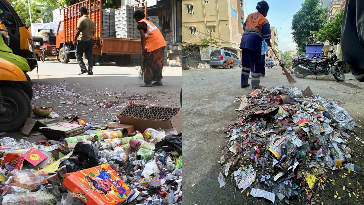 தூய்மைப் பணியாளர்கள் இரவு முழுக்க பட்டாசு கழிவுகளை அகற்றும் பணியில் ஈடுபட்டுள்ளனர். நேற்று மாலை தொடங்கிய இந்த சுத்திகரிப்பு பணிகள் தொடர்ந்து நடந்து வருகின்றன. பல இடங்களில் குவிந்திருக்கும் குப்பைகளை கையால் அள்ளி வாகனங்களில் ஏற்றி அப்புறப்படுத்துகின்றனர்.