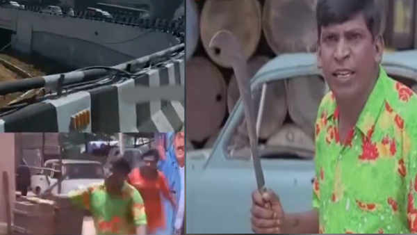 வடிவேலு, பச்சை சட்டை அணிந்துகொண்டு கையில் அரிவாளுடன் ஒரே பகுதியை ஆவேசமாக சுற்றி சுற்றி வளைந்து ஓடிக் கொண்டே இருப்பாரே.. அந்த சீனுடன், கத்திப்பாரா மேம்பாலத்தில் மிக நீளமாக வளைந்துகொண்டே செல்லும் வீடியோவை இணைத்து.. மீம் போட்டு பங்கமாக கலாய்த்துள்ளனர்.