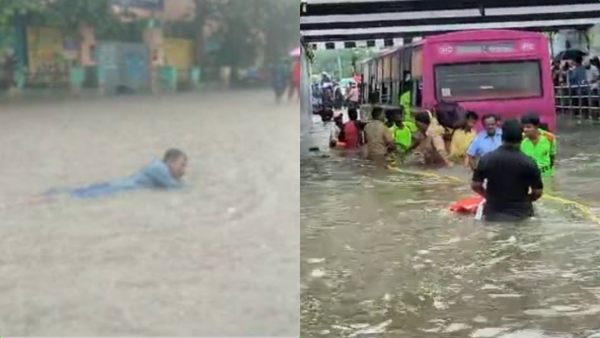 புளியந்தோப்பு பகுதியில் வெள்ளநீர் சூழ்ந்துள்ளது. முழங்கால் அளவிற்கு மேல் தண்ணீர் தேங்கியுள்ளது. அந்த வெள்ளநீரில் ஒருவர் ஜாலியாக நீச்சல் அடிக்கிறார். போதை ஆசாமியாக இருக்கும்.. உள்ளேயும் தண்ணி...வெளியேயும் தண்ணி வெள்ளம் எப்போது வடியுமோ?