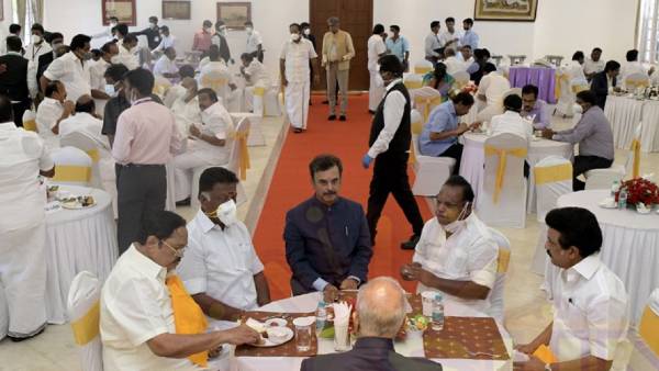 சென்னை: முதல்வராக பதவியேற்று முடித்தவுடன் ஆளுநர் பன்வாரிலால் புரோஹித்துடன் இணைந்து விருந்தில் கலந்து கொண்டார் முதல்வர் மு.க.ஸ்டாலின். அப்போது முன்னாள் சபாநாயகர் தனபால், முன்னாள் துணை முதல்வர் ஓ.பன்னீர் செல்வம் ஆகியோருடன் இணைந்து அவர் சாப்பிட்ட காட்சி வித்தியாசமாக இருந்தது.