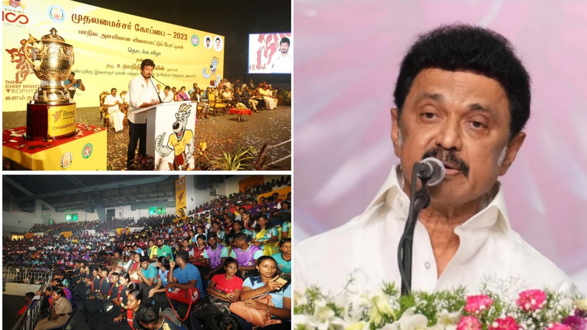 இளைஞர் நலன் மற்றும் விளையாட்டு மேம்பாட்டுத் துறை அமைச்சர் உதயநிதி ஸ்டாலின் தலைமையில் சென்னை நேரு உள் விளையாட்டு அரங்கத்தில் முதலமைச்சர் கோப்பை மாநில அளவிலான விளையாட்டுப் போட்டிகளின் தொடக்க விழா நடைபெற்றது. இதில் பங்கேற்ற, விளையாட்டுத் துறை அமைச்சர் உதயநிதி ஸ்டாலின், 38 மாவட்டங்களைச் சேர்ந்த வீரர்-வீராங்கனைகளின் அணிவகுப்பு மரியாதையை ஏற்றுக்கொண்டார்.