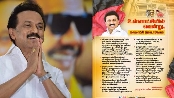 சமூகநீதி, சுயமரியாதை, சாதி வேறுபாடற்ற மதநல்லிணக்கம், ஒருங்கிணைந்த வளர்ச்சி இவற்றை அடிப்படையாகக் கொண்ட 'திராவிட மாடல்' அரசாக விளங்கும் திராவிட முன்னேற்றக் கழகத்தின் திட்டங்களும், செயல்பாடுகளுமே நகர்ப்புற உள்ளாட்சித் தேர்தல் களத்தில் நமக்கான நற்சான்றுக் கருவிகள். நல்லாட்சியின் விளைச்சலை, உள்ளாட்சியில் முழு வெற்றியாக அறுவடை செய்திட, ஊக்கத்துடன் அயராது பாடுபடுங்கள். அ.தி.மு.க ஆளுங்கட்சியாக இருந்தபோது நடைபெற்ற ஊரக உள்ளாட்சித் தேர்தலிலேயே அவர்களின் அனைத்து தில்லுமுல்லுகளையும் மீறி, திராவிட முன்னேற்றக் கழகம்தான் பெரும் வெற்றி பெற்றது. நம்முடைய ஆட்சி அமைந்தபிறகு நடைபெற்ற 9 மாவட்ட ஊரக உள்ளாட்சித் தேர்தலிலும் மகத்தான வெற்றி பெற்றோம். அன்றும் இன்றும் மக்கள் நம் மீதே மாறா நம்பிக்கை வைத்திருக்கிறார்கள். அது என்றென்றும் தொடரும் வகையில் களப்பணியாற்றுங்கள். நகர்ப்புற உள்ளாட்சியில், நாடே போற்றிடும் வகையில் வெல்வோம்; நல்லாட்சியை மேலும் மேலும் முன்னெடுத்துச் செல்வோம்!