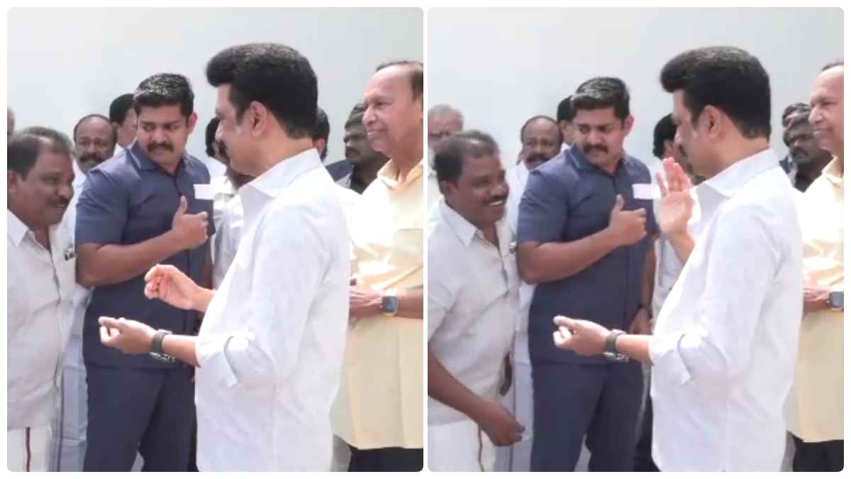 போனவரை திரும்பவும் அழைத்த முதலமைச்சர் ஸ்டாலின், ஏதோ ஆர்வமாக கேட்க, அதற்கு தலையை ஆட்டி சிரித்தவாறு பதிலளித்தார் அரவிந்த் ரமேஷ் எம்.எல்.ஏ.