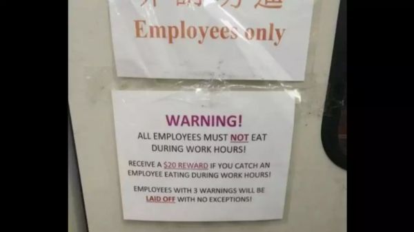 வேலை நேரத்தில் உணவருந்தினால் பணி நீக்கம்! தகவல் கொடுப்பவருக்கு ரூ.1,500 சன்மானம்! எங்கு தெரியுமா?