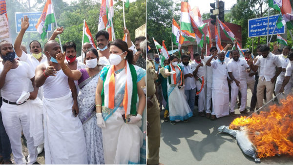 உ.பி.முதல்வர் யோகி ஆதித்யாநாத் உருவ பொம்மை எரிப்பு.. தமிழகத்தில் 2-வது நாளாக காங். போராட்டம்!