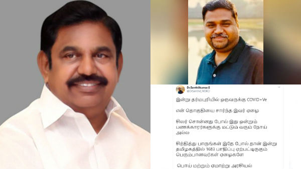 இந்நிலையில், இதுவரை பொத்தி பொத்தி பாதுகாத்த தருமபுரி தொகுதிக்குள் நேற்றுமுன்தினம் கொரோனா புகுந்தது.. இதுகுறித்து திமுக எம்பி டாக்டர் செந்தில்குமார் கருத்து சொல்லும்போது, "தருமபுரியில் ஒருவருக்கு கரோனா உறுதி செய்யப்பட்டுள்ளது.. என் தொகுதியைச் சார்ந்த இவர் ஏழை. சிலர் சொன்னது போல் இது ஒன்றும் பணக்காரர்களுக்கு மட்டும் வரும் நோய் அல்ல. சிந்தித்து பாருங்கள் இதே போல் தான் இன்று தமிழகத்தில் 1,683 பேருக்கு கரோனா நோய்ப் பாதிப்பு ஏற்பட்டிருக்கும் பெரும்பாலானவர்கள் ஏழைகளே.. பொய் மற்றும் ஏமாற்று அரசியல்!" என்று குறிப்பிட்டுள்ளார்.
