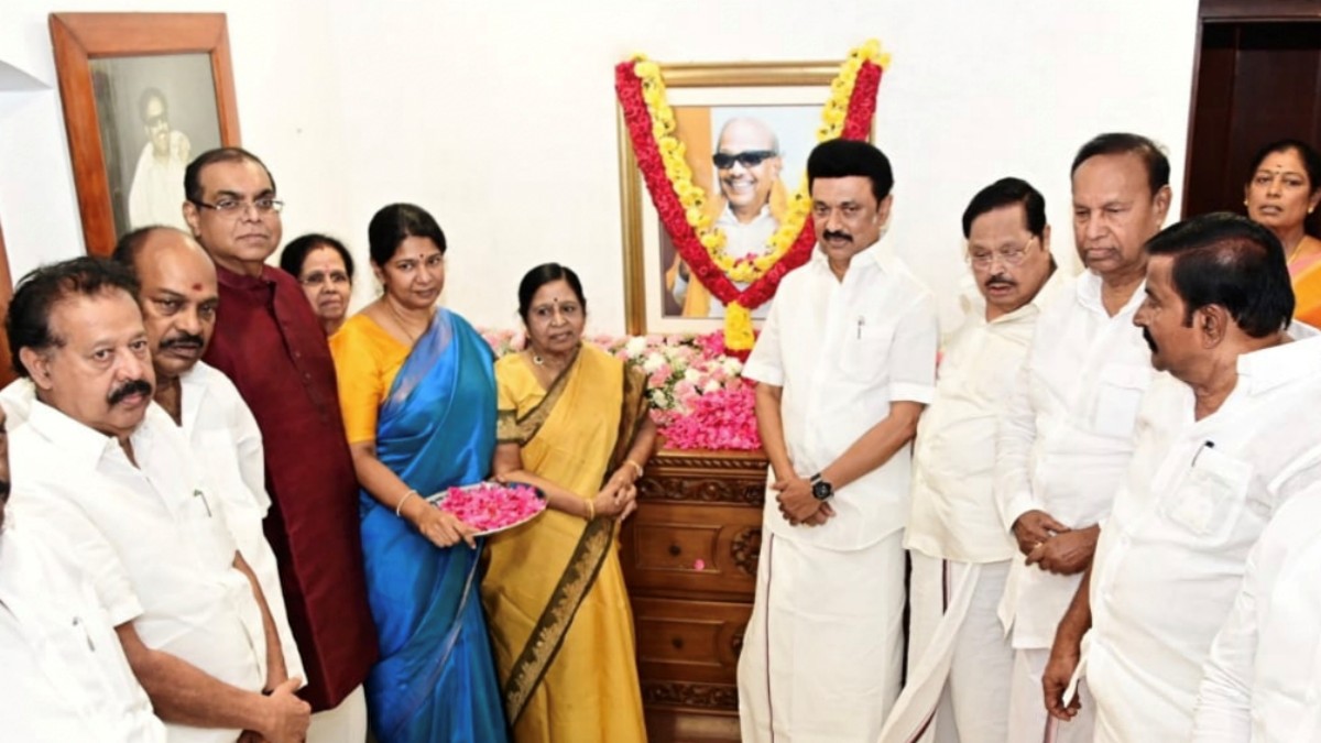 கருணாநிதி நூற்றாண்டு பிறந்தநாளை ஒட்டி சென்னை சிஐடி காலனியில் உள்ள கனிமொழி இல்லத்துக்கு சென்ற முதல்வர் ஸ்டாலின், அங்கு அலங்கரித்து வைக்கப்பட்டிருந்த கருணாநிதி படத்துக்கு மலர்கள் தூவி மரியாதை செலுத்தினார். அப்போது முதலமைச்சரின் முகத்தில் சிரிப்பை பார்க்க முடியவில்லை.