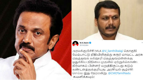 எம்எல்ஏ செந்தில்பாலாஜியின் நிதி ஏற்றுக்கொள்ள மறுக்கப்பட்டதற்கு, திமுக தலைவரும் ட்விட்டரில் கண்டனம் தெரிவித்துள்ளார்.. அரவக்குறிச்சி எம்எல்ஏ செந்தில்பாலாஜி தொகுதி மேம்பாட்டு நிதியிலிருந்து கரூர் மாவட்ட அரசு மருத்துவக் கல்லூரி மருத்துவமனைக்கு ஒதுக்கிய நிதியை முதலில் ஏற்றுக்கொண்ட நிர்வாகம் பின்னர் மறுத்திருப்பது கடும் கண்டனத்துக்குரியது. அரசியல் சூழ்ச்சி செய்ய இது நேரமன்று.. முதலமைச்சர் எடப்பாடி பழனிசாமி கவனிக்கவும்" என்று தெரிவித்து தமிழக அரசுக்கு தெரியப்படுத்தி உள்ளார்.