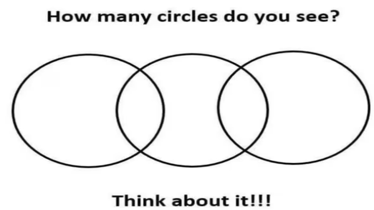 இங்கு ஒரு புகைப்படம் கொடுக்கப்பட்டுள்ளது. அதில் மூன்று பெரிய வட்டங்கள் கொடுக்கப்பட்டுள்ளன. இவற்றில் எத்தனை வட்டங்கள் இருக்கின்றன என்பதை நீங்கள் கண்டறிய வேண்டும். நன்றாக உற்று பாருங்கள், சுற்றி முற்றி பாருங்கள்! ஒரே ஆங்கிளிலேயே பார்வையை வைக்காதீர்கள்.