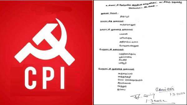 பவானி, புளியங்குடி, அதிராம்பட்டினம், போடிநாயக்கனூர் நகராட்சி துணைத் தலைவர் பதவிகள்; கூத்தைப்பார், ஊத்துக்குழி, மேல சொக்கநாதபுரம், கீரமங்கலம், சேத்தூர், ஜம்பை பேரூராட்சிகளில் துணைத் தலைவர் பதவிகளும் இந்திய கம்யூனிஸ்ட் கட்சிக்கு வழங்கப்பட்டுள்ளதாக அறிவிக்கப்பட்டுள்ளது.