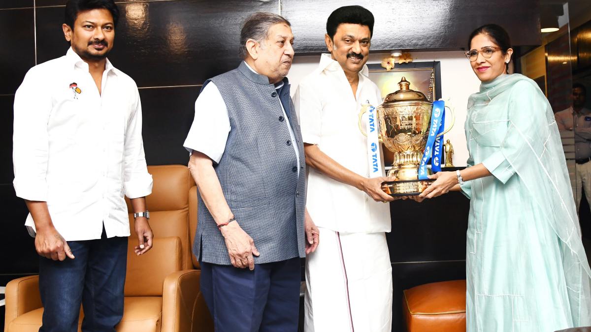 இந்நிலையில், ஐபிஎல் 2023 கிரிக்கெட் போட்டியில் சென்னை சூப்பர் கிங்ஸ் அணி வெற்றி பெற்றதையொட்டி சாம்பியன் கோப்பையை இந்தியா சிமெண்ட்ஸ் நிறுவனத்தின் துணைத் தலைவர் மற்றும் மேலாண்மை இயக்குநர் என்.சீனிவாசன், இந்தியா சிமெண்ட்ஸ் நிறுவனத்தின் முழு நேர இயக்குநர் ரூபா குருநாத் ஆகியோர் இன்று தமிழ்நாடு முதலமைச்சர் மு.க.ஸ்டாலின் அவர்களிடம் காண்பித்து வாழ்த்து பெற்றனர்.