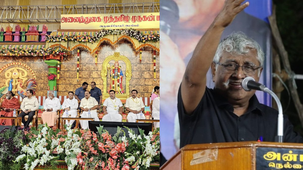 திமுக அரசு செயல்பாடுகள்: அத்துடன் பழநியில் அனைத்துலக முத்தமிழ் முருகன் மாநாடு நடத்துவது திமுக அல்ல. தமிழ்நாடு அரசு. ஒரு அரசு என்பது அனைவருக்கும் பொதுவானது. அதனால்தான் கலைஞர் ஆட்சியில் ஓடாது நின்ற திருவாரூர் தேர் ஓடியது. கடந்த 3 ஆண்டுகால திமுக ஆட்சியில்தான் ஏறத்தாழ 1,500 கோவில்களுக்கு குடமுழுக்கு விழாக்கள் நடத்தப்பட்டுள்ளன. இந்த திமுக ஆட்சியில்தான் கோவில்களுக்குச் சொந்தமான சுமார் 6,000 ஏக்கர் நிலம் மீட்கப்பட்டுள்ளது. ஆக அனைத்துலக முத்தமிழ் முருகன் மாநாடு என்பது தேர்தலை நோக்கியது அல்ல. அது ஓர் அரசின் இயல்பான நிகழ்வும் செயல்பாடும். இவ்வாறு பேராசிரியர் சுப.வீரபாண்டியன் நமது ஒன் இந்தியா தமிழுக்கு தெரிவித்தார்.
