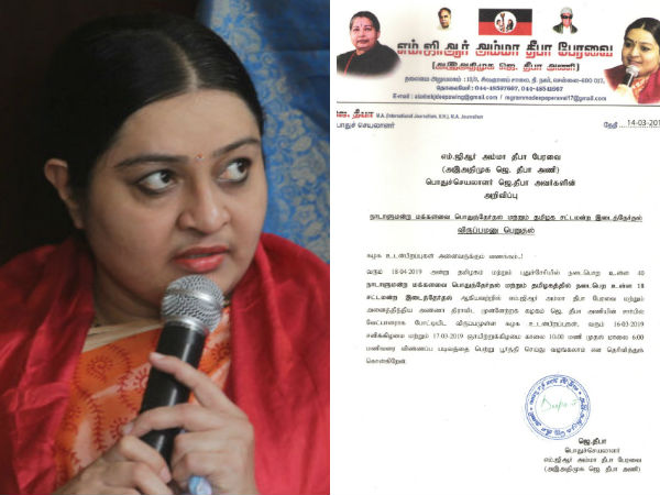"மக்களவை மற்றும் 18 சட்டப் பேரவைத் தேர்தலில் எம்ஜிஆர் அம்மா தீபா பேரவை சார்பில் போட்டியிட விரும்புவோர் வரும் 16, 17 தேதிகளில் காலை 10 மணி முதல் மாலை 6 மணி வரை விருப்ப மனுக்களை பெற்று பூர்த்தி செய்து கட்சி அலுவலகத்துக்கு வழங்கலாம்" என கேட்டுக் கொண்டுள்ளார்.