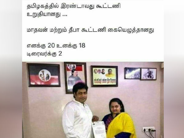 இப்போது இந்த போட்டோவை பதிவிட்டு, அதன் கீழே நெட்டிசன்களே வரும் தேர்தலில் 40 தொகுதியையும் பிரித்து இந்த பேரவைக்கே தந்துவிட்டார்கள். அதில், "தமிழகத்தில் இரண்டாவது கூட்டணி உறுதியானது... மாதவன் மற்றும் தீபா கூட்டணி கையெழுத்தானது..எனக்கு 20 உனக்கு 18 டிரைவர்க்கு 2" என்று கிண்டலாக பதிவிட்டுள்ளனர்.