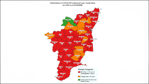 தமிழகத்தில் உள்ள 38 மாவட்டங்களில் 30 மாவட்டங்களில் சிகப்பு மண்டலங்களாகவும் 7 மாவட்டங்கள் ஆரஞ்சு மண்டலமாகவும் ஒரே ஒரு மாவட்டம் மட்டும் பச்சை மண்டலமாகவும் வகைப்படுத்தப்பட்டுள்ளன. 15க்கும் அதிகமானோருக்கு கொரோனா பாதிப்பு இருந்தால் அவை சிகப்பு மண்டலமாகவும் அதைவிட குறைவாக இருந்தால் ஆரஞ்சு மண்டலமாகவும் கடந்த 28 நாட்களாக புதிய பாதிப்புகள் இல்லாதது பச்சை மண்டலமாகவும் வகைப்படுத்தப்பட்டுள்ளது.