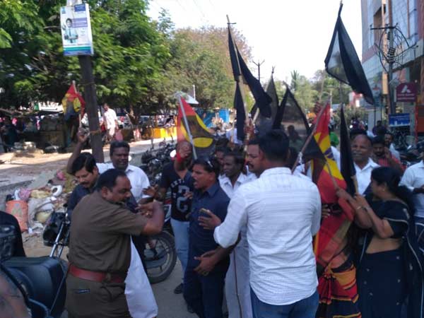 கையில் கருப்புக் கொடிகள் மற்றும் தங்கள் கட்சி கொடிகளுடன் அவர்கள் வந்திருந்தனர். ஆண்களும் பெண்களும் திரளாக இதில் பங்கேற்றனர். ஆனால், போராட்டத்தை நடத்துவதற்கு போலீசார் அனுமதி தர மறுப்பு தெரிவித்து அவர்களை அங்கிருந்து அப்புறப்படுத்தினர். இதனால் கோபமடைந்த தேமுதிக தொண்டர்கள், காட்பாடி- சித்தூர் சாலையில் அமர்ந்து சாலை மறியல் போராட்டத்தில் ஈடுபட்டனர். இதனால் போக்குவரத்து பாதிப்பு ஏற்பட்டது.