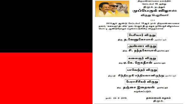 ஆண்டுதோறும் செப்டம்பர் 15-ம் தேதி திமுக முப்பெரும் விழா நடத்தி கட்சியின் மூத்த முன்னோடிகளுக்கு விருதும், பொற்கிழியும் வழங்கி கவுரவிக்கும். அந்த வகையில் இந்த ஆண்டுக்கான முப்பெரும் விழா திருவண்ணாமலையில் செப்டம்பர் 15-ம் தேதி நடைபெறுகிறது.