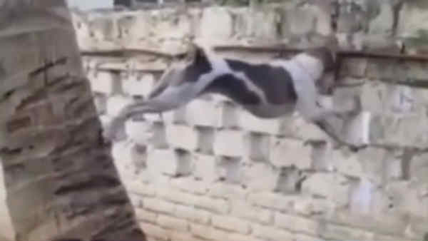 நாய் ஒன்று சுவரில் ஏறி சண்டையை வேடிக்கைப் பார்க்கும் வீடியோ இணையத்தில் வைரலாகியுள்ளது.