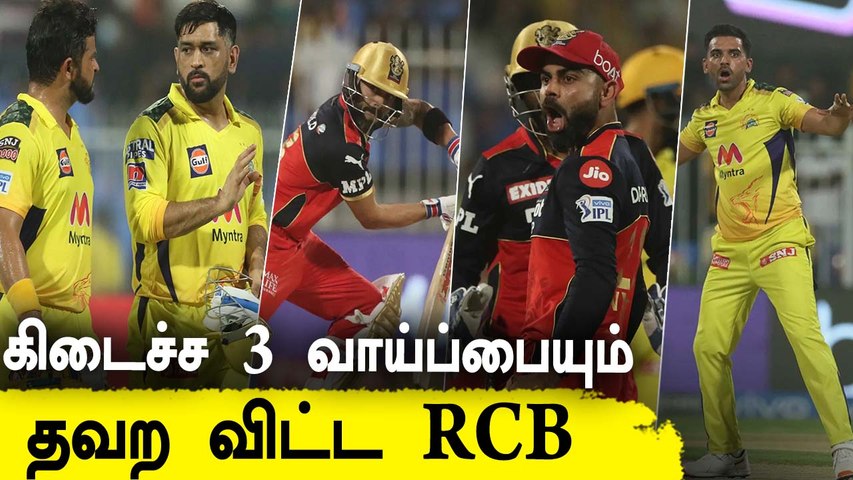 கோலி தனது வழக்கமான டிரேட் மார்க் ஷாட்கள் மூலம் பவுண்டரிகளாக திரட்ட, தேவ்தத் படிக்கல் அதிரடியான சிக்ஸர்களை விளாசினார். 13.2 ஓவர்களில் 'ஸ்லோ பால் ஸ்பெஷலிஸ்ட்' பிராவோ கோலிக்கு செக் வைத்து 53 ரன்களில் வெளியேற்ற, ஆட்டம் அப்படியே சென்னை பக்கம் திரும்பியது. தொடர்ந்து தேவ்தத் படிக்கல், அதிரடி சூரர்கள் டி வில்லியர்ஸ், மேக்ஸ்வெல் கீ கொடுத்த பொம்மை போல் அடுத்தடுத்து அவுட்டாகி வெளியேற 200 ரன்களுக்கு மேல் எடுக்க வேண்டிய பெங்களுரு 156 ரன்னில் அடங்கியது.
