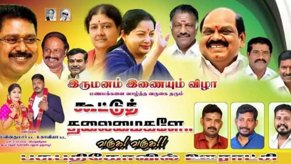 இந்த நிலையில் தஞ்சாவூரில் இன்று நடைபெற்ற ஓபிஎஸ் ஆதரவாளர் இலல திருமண விழாவைொயொடடி வைக்கப்பட்டுள்ள பிளக்ஸ் பேனரில் எடப்பாடி பழனிசாமியின் படம் இல்லாமல் உள்ளது. அந்த பேனரில் அறிஞர் அண்ணா, எம்ஜிஆர், ஜெயலலிதா, சசிகலா, தினகரன், ஓபிஎஸ், வைத்திலிங்கம் உள்ளிட்டோர் படங்கள் இடம்பெற்றுள்ளன.