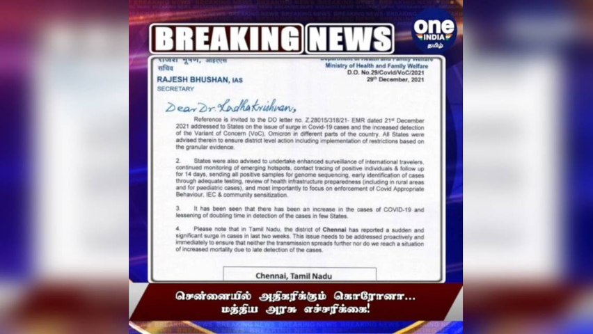கடந்த டிசம்பர் முதல் வாரம் தலைநகர் சென்னையில் 1088 பேருக்கு வைரஸ் பாதிப்பு ஏற்பட்டிருந்தது. இது டிச. 2ஆம் வாரம் 987ஆக குறைந்திருந்தது. இருப்பினும், 3ஆம் வாரம் இது 1039ஆக உயரத் தொடங்கியது. குறிப்பாக இந்த கடைசி வாரம் 1720 பேருக்கு வைரஸ் பாதிப்பு கண்டறியப்பட்டுள்ளது. இந்நிலையில், சென்னையில் கட்டுப்பாடுகளைத் தீவிரப்படுத்துமாறு மத்திய சுகாதாரத் துறை செயலாளர் ராஜேஷ் பூஷண் மருத்துவத்துறை செயலாளர் ராதாகிருஷ்ணனுக்குக் கடிதம் எழுதியிருந்தார்.
