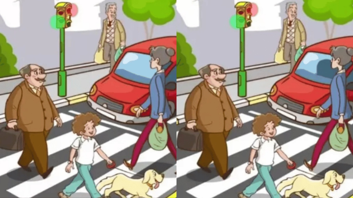 படத்தை நன்கு உற்று பாருங்கள்.. சாலை ஒன்றை மூன்று பாதசாரிகள் கடந்து செல்கிறார்கள். அதில் ஒரு சிறுவன் கையில் நாய்க்குட்டி ஒன்றை இழுத்து செல்கிறான். வயதான முதியவர் தனது கையில் பை ஒன்றை வைத்து இருக்கிறார். அதேபோல இளம்பெண்ணும் ஹேண்ட் பைக் ஒன்றை வைத்துக்கொண்டு செல்கிறார். பாதசாரிகள் கடக்க ஏதுவாக காரும் நின்று கொண்டு இருக்கிறது. இதே காட்சியமைப்புகள் கொண்ட இரண்டு படங்கள் கொடுக்கப்பட்டுள்ளன.