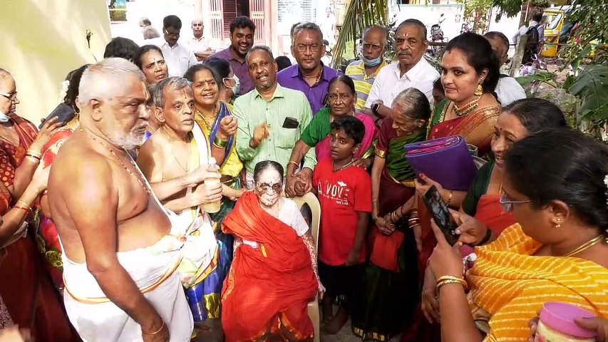 இதனையடுத்து, சங்கரா காலனியில் உள்ள திருமண மண்டபத்தில், இதற்காக வேத விற்பனர்கள் சிறப்பு பூஜை செய்து, மீனாட்சி பாட்டியை புனித நீராட்டி, புத்தாடை அணிய வைத்து மேடையில் அமர வைத்தனர். கணபதி ஹோமம் நவக்கிரக ஹோமம் நட்சத்திர கோமம் ஆயுசு ஹோமங்களை 11 சாஸ்திரிகள் 11 நடத்தினர். குடும்பத்தினர் சீர்வரிசை பணமாலை அணிவித்து, 100 வயதை கடந்த மீனாட்சி பாட்டியிடம் அவரது குடும்பத்தினர் மட்டுமல்ல, ஏராளமானோர் ஆசீர்வாதம் பெற்றனர்.