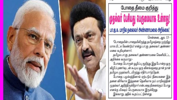 இந்நிலையில், போதைப் பொருள் ஒழிப்பு விவகாரத்தில், முதல்வர் ஸ்டாலினுக்கு அண்ணாமலை தெரிவித்த பாராட்டுக்களை மட்டும், திமுகவின் அதிகாரப்பூர்வ நாளிதழான "முரசொலி"யில் செய்தியாக வெளியாகி இருந்தது.. அதாவது அண்ணாமலை வைத்த கோரிக்கை, வேண்டுகோள், திமுகவை சாடியது எதுவுமே பிரசுரிக்காமல், முதல்வரை பாராட்டியது மட்டும் பிரசுரிக்கப்பட்டு இருந்தது...