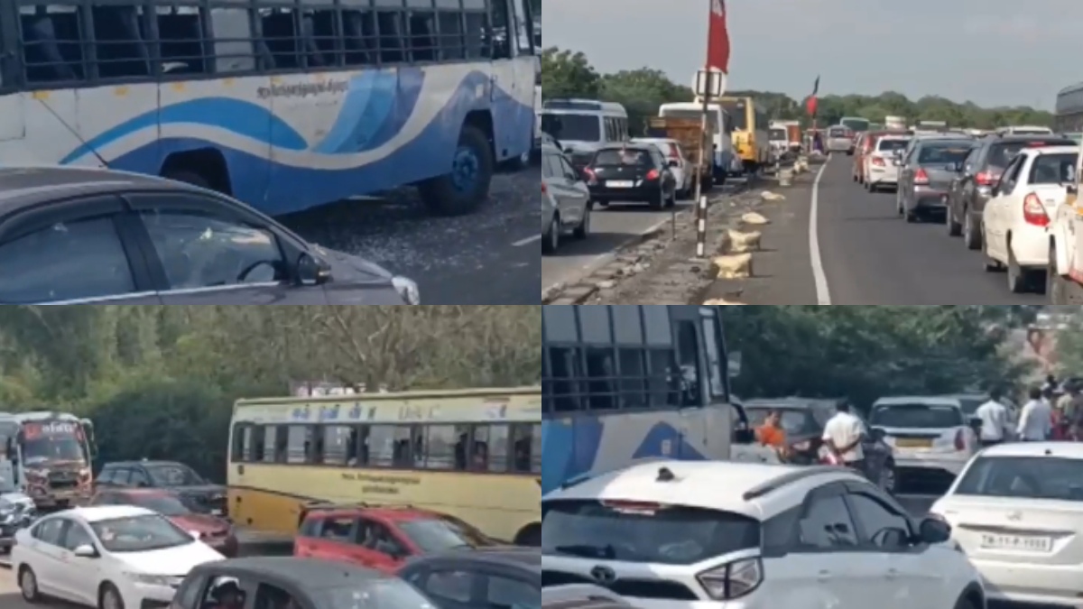 சுமார் 5 கிலோமீட்டர் தொலைவுக்கு வாகனங்கள் அணிவகுத்து நின்றன. சென்னை - திருச்சி தேசிய நெடுஞ்சாலையில் உள்ள மகேந்திரா சிட்டியை கடந்து சிங்கம்பெருமாள் கோவில் வரை போக்குவரத்து நெரிசல் ஏற்பட்டுள்ளது. இதுபற்றி அறிந்த போலீசார் சம்பவ இடத்துக்கு வந்து போக்குவரத்து நெரிசலை சரிசெய்யும் பணியில் ஈடுபட்டு வருகின்றனர். தற்போது வாகனங்கள் மெல்ல மெல்ல நகர தொடங்கி உள்ளன.