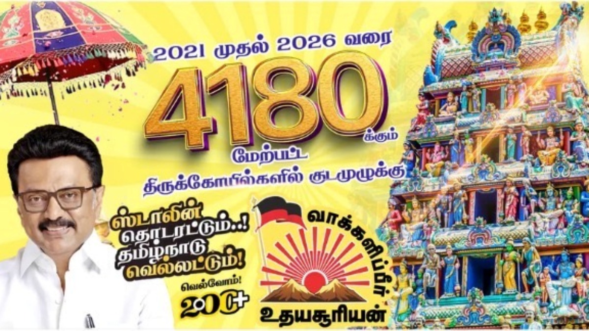 இந்த நிலையில் தான் அடுத்த ஐந்து ஆண்டுகளில் 5,000 கோவில்களுக்கு குடமுழுக்கு நடத்த இலக்கு வைக்கப்பட்டுள்ளது. கோவில் மறுசீரமைப்பு நிதி ஆண்டுக்கு 25 கோடி ரூபாயாக உயர்த்தப்படும். கிராம தேவதைக் கோவில்களைப் புதுப்பிக்கவும், பழமையான கோவில்களைப் பாதுகாக்கவும் ஆண்டுக்கு 100 கோடி ரூபாய் ஒதுக்கப்படும் என்று பல்வேறு வாக்குறுதிகளை அளித்திருக்கிறது திமுக.