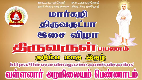 சென்னை: திருவருள் பயணம் குடும்ப மாத இதழும் வள்ளலார் அறநிலையம் பெண்ணாடமும் இணைந்து முதலாம் ஆண்டு மார்கழி திருவருட்பா இசை விழாவை நடத்தி உள்ளன. இவ்விழா டிசம்பர் 16 ம் தேதி துவங்கி ஜனவரி 13 வரை ஒரு மாத நிகழ்வாக நடத்தப்பட்டது.